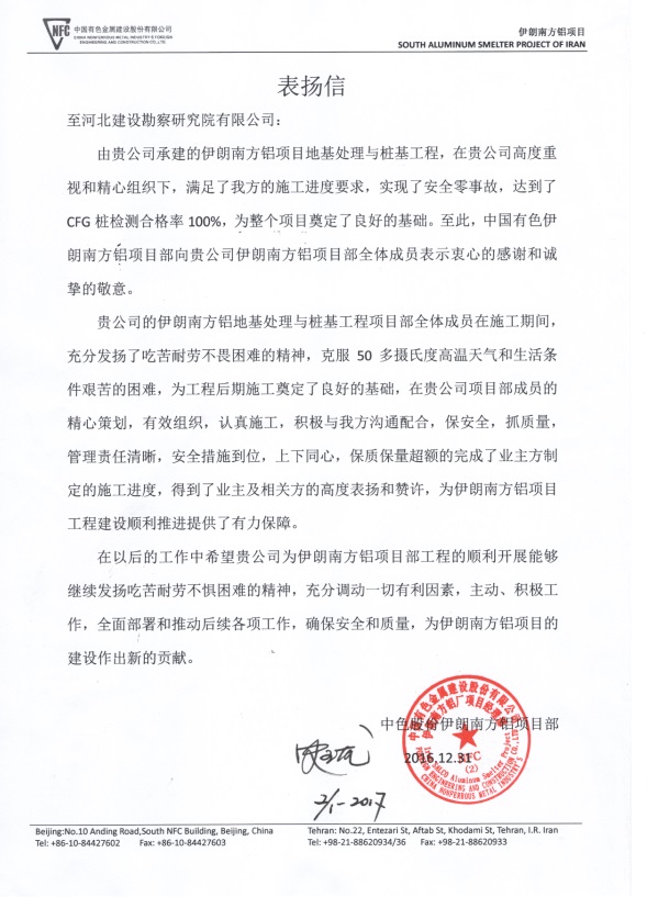 2016年12月31日,公司收到中色股份伊朗南方鋁項目發(fā)來的表揚信。由我公司承建的伊朗南方鋁項目地基處理與樁基工程,在我公司的高度重視和精心組織下,滿足了甲方的施工進度要求,實現(xiàn)了安全零事故,達到了CFG樁檢測合格率100%,保質(zhì)保量超額完成了業(yè)主方制定的施工進度,得到了業(yè)主及相關(guān)方的高度表揚和贊許。