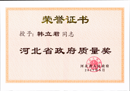 我公司獲得了由河北省人民政府頒發(fā)的“2016年河北省政府質(zhì)量獎(jiǎng)”組織提名獎(jiǎng);公司董事長韓立君同志榮獲“河北省政府質(zhì)量獎(jiǎng)”個(gè)人獎(jiǎng)。省委領(lǐng)導(dǎo)為董事長頒發(fā)了獲獎(jiǎng)證書和獎(jiǎng)杯。