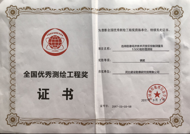2017年9月7日,由我公司完成的滄州臨港經(jīng)濟(jì)技術(shù)開發(fā)區(qū)控制測量及1:500地形圖測繪項目,被中國測繪地理信息學(xué)會授予全國優(yōu)秀測繪工程銅獎。