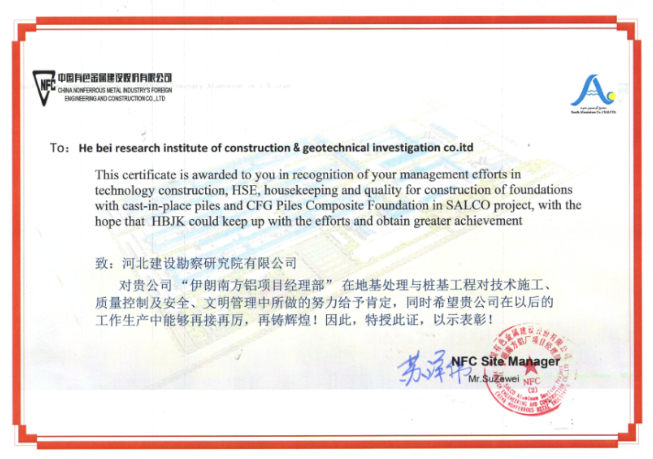 我公司承建的伊朗南方鋁項目,自開工以來精心策劃、有效組織、認(rèn)真施工、積極與業(yè)主配合,保質(zhì)保量完成了施工進(jìn)度。在施工過程中業(yè)主對我公司伊朗南方鋁項目部在技術(shù)施工、質(zhì)量控制及安全、文明管理中所做的努力給予了肯定,并授予表彰證書。