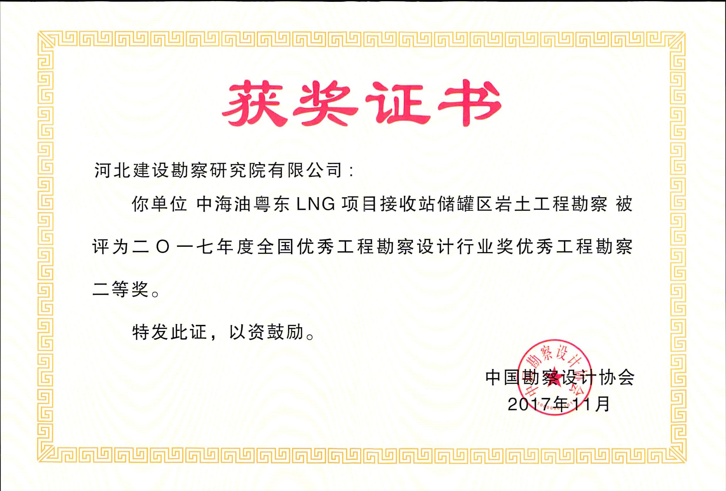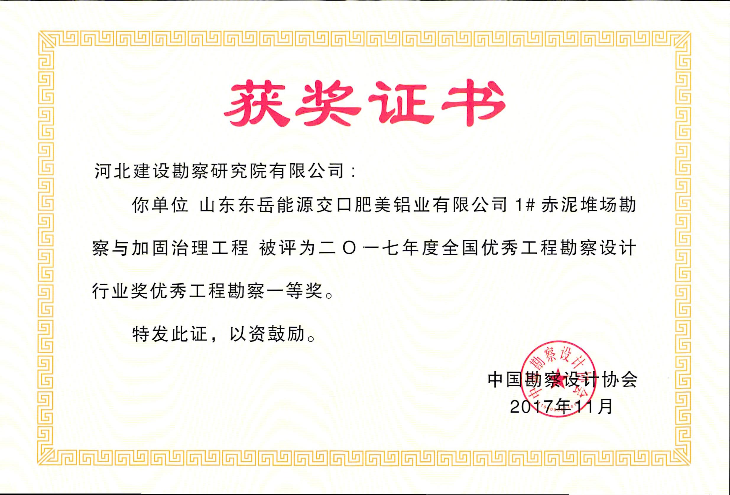 根據(jù)中國勘察設(shè)計(jì)協(xié)會2017年11月29日發(fā)布的中設(shè)協(xié)字【2017】85號文件《關(guān)于公布2017年度全國優(yōu)秀工程勘察設(shè)計(jì)行業(yè)獎評選結(jié)果的通知》,我公司兩項(xiàng)工程獲優(yōu)秀工程勘察獎。其中,山東東岳能源交口肥美鋁業(yè)有限公司1#赤泥堆場勘察與加固治理工程榮獲優(yōu)秀工程勘察一等獎,中海油粵東LNG項(xiàng)目接收站儲罐區(qū)巖土工程勘察榮獲優(yōu)秀工程勘察二等獎。