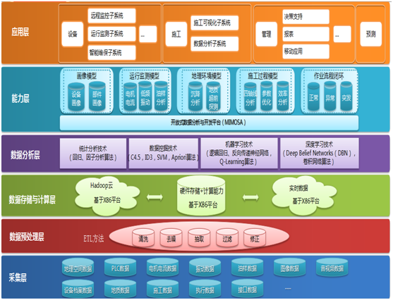 本項目在研究盾構(gòu)的運行狀態(tài)進行監(jiān)控和管理的基礎(chǔ)上,將盾構(gòu)運行狀態(tài)參數(shù)及工況數(shù)據(jù),通過采集終端經(jīng)PLC、光纖、路由器、VPN隧道傳輸至遠程數(shù)據(jù)中心,數(shù)據(jù)存儲使用工業(yè)級實時數(shù)據(jù)庫,采集頻率可達毫秒級。業(yè)務(wù)基礎(chǔ)—對各類盾構(gòu)機(機、電、液)深入分析,提供盾構(gòu)軌跡、管片軌跡、單環(huán)分析、掘進效率等統(tǒng)計分析功能,以便管理決策層把握各項目施工情況。構(gòu)建盾構(gòu)/TBM施工與健康管理平臺,實現(xiàn)以下四個功能:1、盾構(gòu)遠程監(jiān)控,2、智能維保,3、盾構(gòu)施工輔助巡航,4、組態(tài)化模塊定制。進行盾構(gòu)施工大數(shù)據(jù)相關(guān)性、關(guān)聯(lián)分析、影響因素分析,關(guān)鍵子系統(tǒng)健康管理和故障診斷,基于大數(shù)據(jù)的比較、聚類、預(yù)測實現(xiàn)對盾構(gòu)施工進行遠程管理。