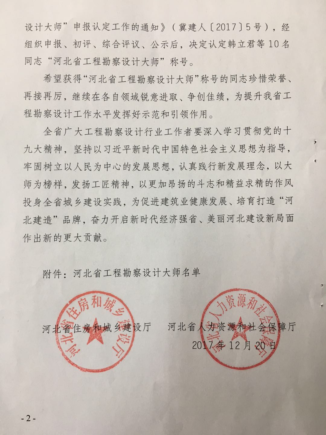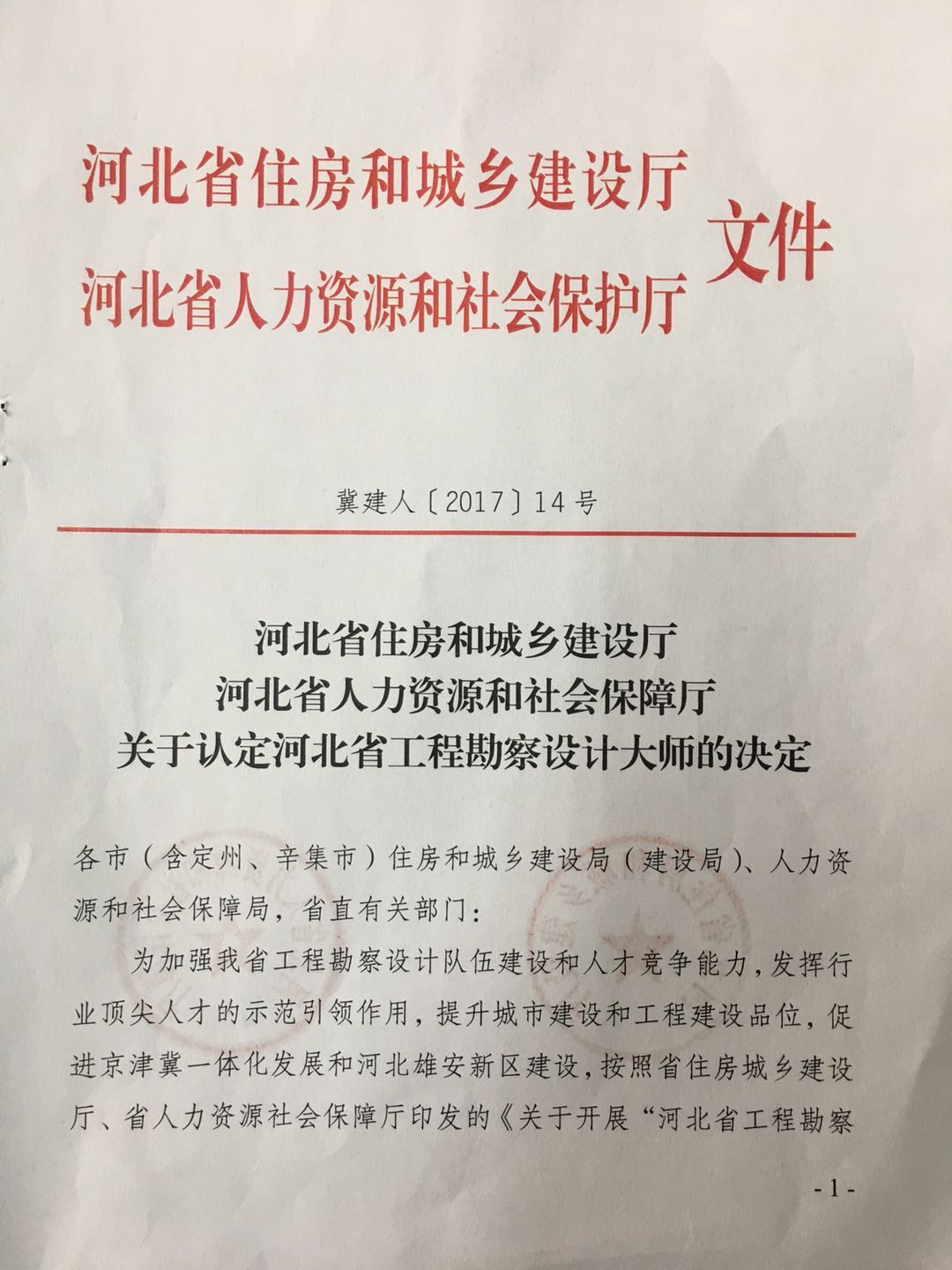 近日,從河北省住房和城鄉(xiāng)建設(shè)廳、河北省人力資源和社會(huì)保護(hù)廳聯(lián)合印發(fā)的《關(guān)于認(rèn)定河北省工程勘察設(shè)計(jì)大師的決定》獲悉,公司董事長韓立君榮獲“河北省工程勘察設(shè)計(jì)大師”稱號(hào)。