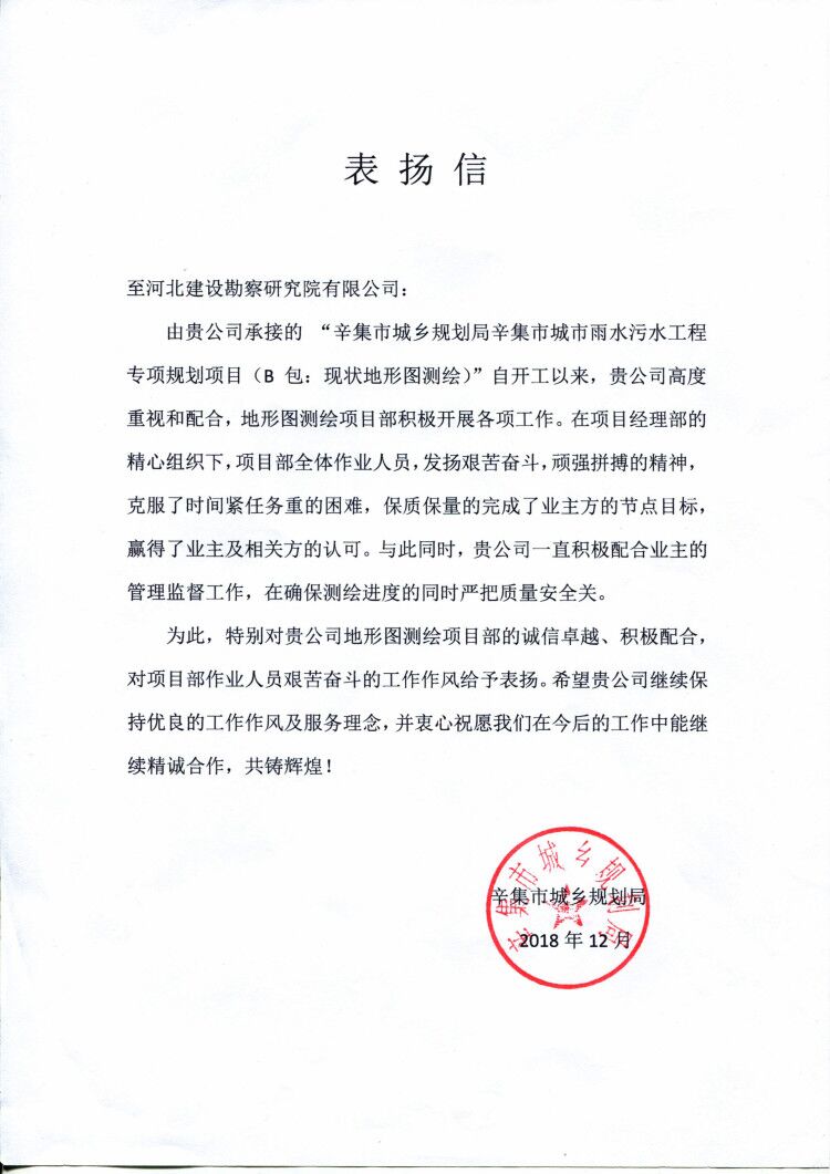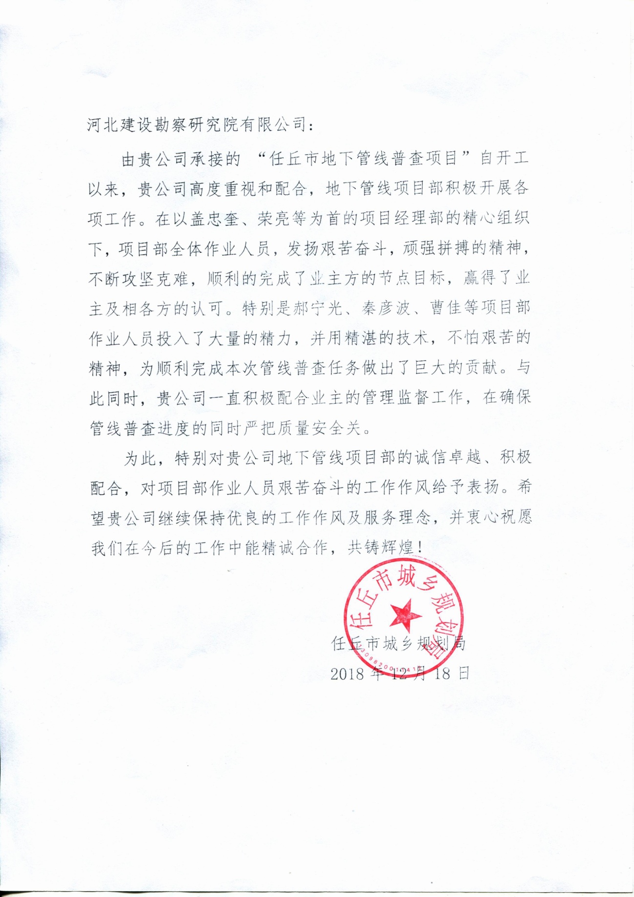 近日,公司收到辛集市城鄉(xiāng)規(guī)劃局和任丘市城鄉(xiāng)規(guī)劃局發(fā)來的表揚(yáng)信,分別對我公司誠信卓越、積極配合及項(xiàng)目部作業(yè)人員艱苦奮斗的工作作風(fēng)給予表揚(yáng)。特別是在任丘地下管線普查項(xiàng)目中,在以蓋忠奎、榮亮為代表的項(xiàng)目部精心組織下,項(xiàng)目全體作業(yè)人員,發(fā)揚(yáng)艱苦奮斗、頑強(qiáng)拼搏的精神,不斷攻堅(jiān)克難,保質(zhì)保量提前完成了生產(chǎn)任務(wù),贏得了業(yè)主的認(rèn)可。甲方特發(fā)來表揚(yáng)信,對我公司所作出的貢獻(xiàn)表示感謝!并希望我們繼續(xù)保持優(yōu)良的工作作風(fēng)及服務(wù)理念,精誠合作,共創(chuàng)輝煌!