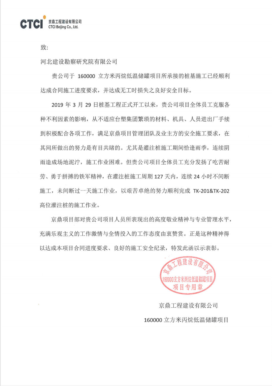我公司承接的160000立方米丙烷低溫儲(chǔ)罐樁基施工工程,自開工以來,項(xiàng)目部全體員工克服各種不利因素的影響,經(jīng)過艱苦卓絕的不懈努力,已順利達(dá)成合同施工進(jìn)度要求,并達(dá)成無工時(shí)損失之良好安全目標(biāo),滿足京鼎項(xiàng)目團(tuán)隊(duì)及業(yè)主方的安全施工要求,已圓滿完成各項(xiàng)施工任務(wù),順利完工。期間所表現(xiàn)出的高度敬業(yè)精神和專業(yè)管理水平,得到了業(yè)主和監(jiān)理的一致好評,近期特向我公司發(fā)函予以表揚(yáng)。