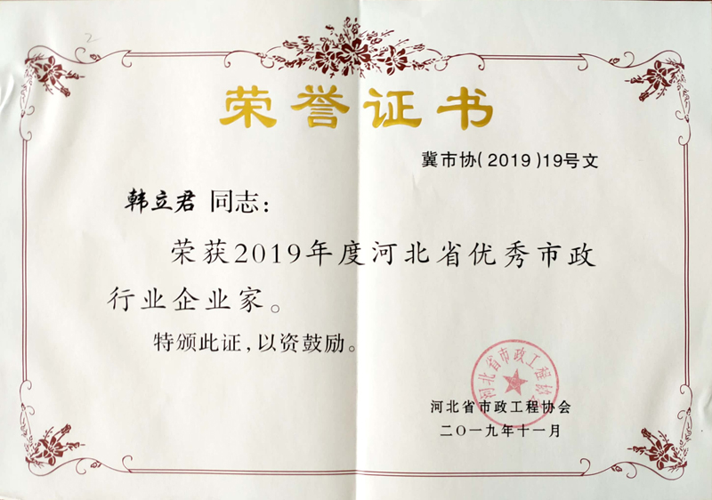 近日公司被河北省市政工程協(xié)會評為“2019年度河北省優(yōu)秀市政施工企業(yè)”;公司董事長韓立君同志獲評“2019年度河北省優(yōu)秀市政行業(yè)企業(yè)家”。