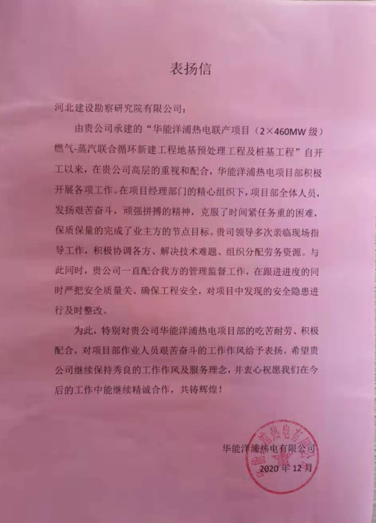 華能洋浦熱電聯(lián)產(chǎn)項目(2×460MW級)燃氣-蒸汽聯(lián)合循環(huán)新建工程地基預(yù)處理工程及樁基工程自開工以來,積極開展各項工作,精心組織,克服了時間緊任務(wù)重的困難,保質(zhì)保量完成了節(jié)點目標。特對項目部的吃苦耐勞、積極配合,對項目部作業(yè)人員艱苦奮斗的工作作風(fēng)給予表揚。