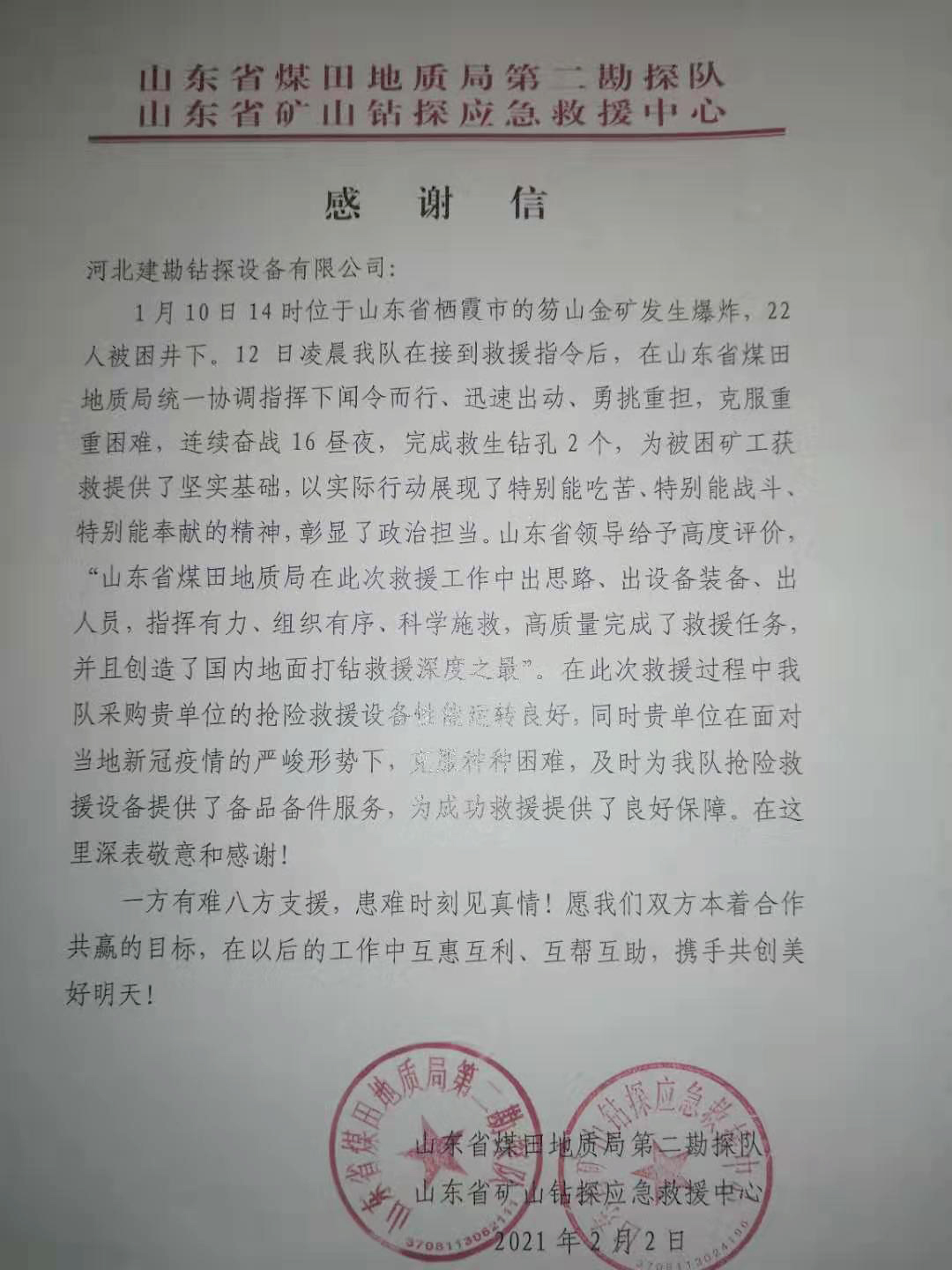 1月10日14時(shí),位于山東省棲霞市的笏山金礦發(fā)生爆炸,22人被困井下。山東省煤田地質(zhì)局第二勘探隊(duì)、山東省礦山鉆探應(yīng)急救援中心連續(xù)奮戰(zhàn)16晝夜,完成救生鉆孔2個(gè),為被困礦工獲救提供了堅(jiān)實(shí)基礎(chǔ),高質(zhì)量完成了救援任務(wù),并且創(chuàng)造了國內(nèi)地面打鉆救援深度之最。在此次救援過程中,河北建勘鉆探設(shè)備公司提供的搶險(xiǎn)救援設(shè)備性能運(yùn)轉(zhuǎn)良好,并且在面對當(dāng)?shù)匦鹿谝咔榈膰?yán)峻形勢下,克服種種困難,及時(shí)為救援隊(duì)搶險(xiǎn)救援設(shè)備提供了備品備件服務(wù),為成功救援提供了良好保障。為此,山東省煤田地質(zhì)局第二勘探隊(duì)和山東省礦山鉆探應(yīng)急救援中心在感謝信中深表敬意和感謝,并希望雙方本著合作共贏的目標(biāo),在以后的工作中互惠互利、互幫互助,攜手共創(chuàng)美好明天。