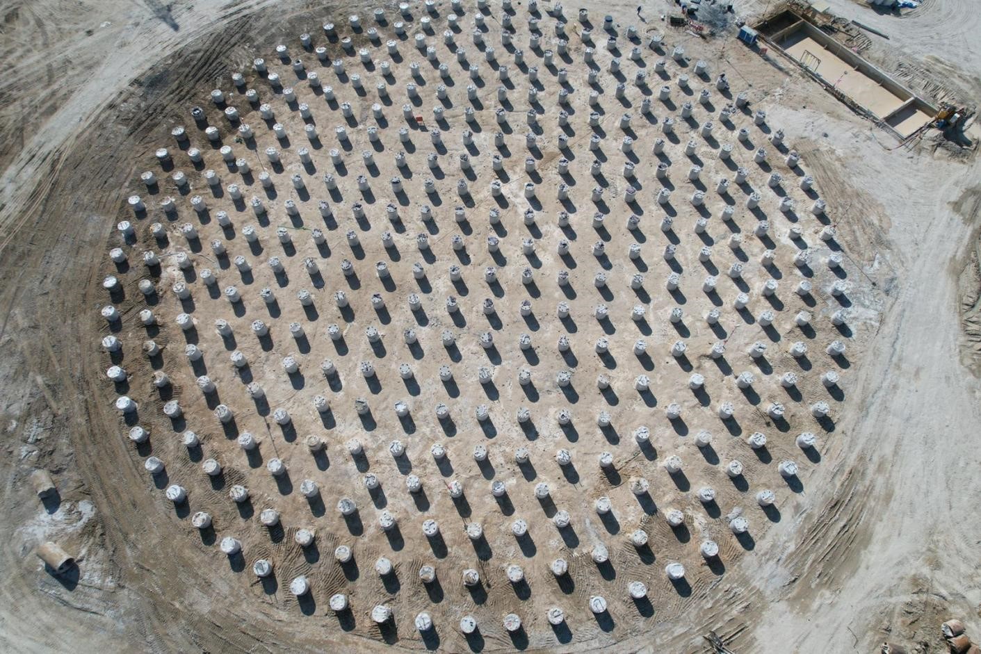 我公司承擔(dān)了該項(xiàng)目3座20萬(wàn)m³儲(chǔ)罐的工程樁施工相關(guān)工作,包括試樁工程以及T-6201、T-6202、T-6203儲(chǔ)罐樁基工程。本項(xiàng)目?jī)?chǔ)罐樁基工程于2021年03月21日開(kāi)工, 2021年06月03日三座LNG儲(chǔ)罐樁基工程全部完工設(shè)備撤場(chǎng)。每個(gè)儲(chǔ)罐376根,共完成1128根樁,地面以下樁長(zhǎng)60m,短柱高1.266m和1.566m,砼強(qiáng)度等級(jí)C40、抗?jié)B等級(jí)P10、添加防腐阻銹劑;采用泥漿護(hù)壁成孔灌注樁及樁身、樁帽一體化成型施工工藝;三個(gè)儲(chǔ)罐單樁豎向抗壓靜載共檢測(cè)18根,低應(yīng)變檢測(cè)1128根,超聲波共檢測(cè)120根,檢測(cè)結(jié)果均滿足設(shè)計(jì)要求。