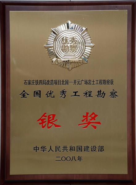 根據(jù)中華人民共和國建設部第807號文件,關于公布2006年度全國優(yōu)秀工程勘察設計獎的公告,我單位石家莊鐵四局改造項目北國—開元廣場巖土工程勘察獲銀質獎。
