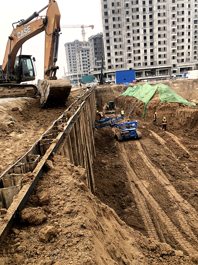 本工程位于雄安新區(qū),由中電建河北雄安智匯城建設發(fā)展有限公司投資建設,我公司負責本項目基坑支護和樁基施工,共完成噴面約3290m²、土釘約5580m、錨索約6580m、鋼腰梁約2620m、鋼板樁打拔約4600m、擋水墻約212m;鉆孔灌注樁共完成420余根,其中直徑0.6m工程樁完成50余根,直徑0.8m工程樁完成370余根;
