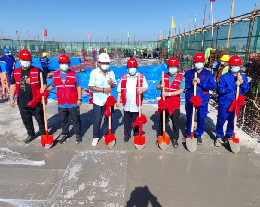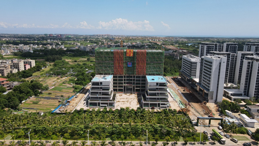 海南辦公樓占地面積15畝,地下二層,地上12層,總建筑面積47527平方米。工程自2021年9月13日現場舉辦開工儀式以來,經過11個月的合力攻堅,克服高溫、臺風、疫情等重重難關,如期實現了一個個關鍵節(jié)點:2021年10月25日第一根基礎工程樁混凝土灌注順利完成;2021年12月4日開始8萬方土方開挖的任務;2022年1月29日,實現了基礎筏板的澆筑;2022年4月10日,完成了地下二層車庫施工,主體如期“沖”出正負零;2022年6月24日,東、西配樓主體按計劃日期封頂。如今項目迎來了主體封頂的里程碑,為后期工程樹立了標桿!
