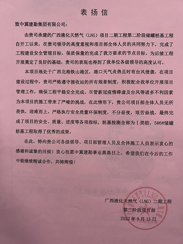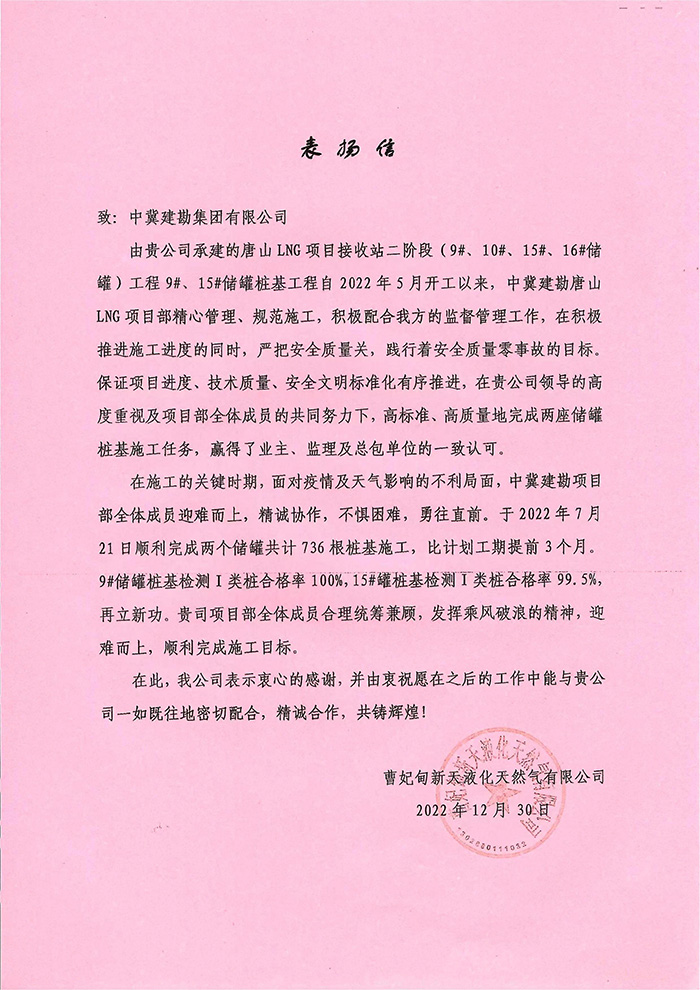 2022年12月30日我公司收到業(yè)主曹妃甸新天液化天然氣有限公司發(fā)來(lái)的表?yè)P(yáng)信。由我公司承建的唐山LNG項(xiàng)目接收站二階段(9#、10#、15#、16#儲(chǔ)罐)工程9#、15#儲(chǔ)罐樁基工程,主要施工內(nèi)容為736根樁徑1.4m、樁長(zhǎng)71m/74m混凝土灌注樁,本項(xiàng)目自2022年5月31日開(kāi)工以來(lái),在唐山LNG項(xiàng)目部精心管理、規(guī)范施工下,嚴(yán)把安全質(zhì)量關(guān),踐行著安全質(zhì)量零事故目標(biāo),于2022年7月21日順利完成所有施工任務(wù),贏得業(yè)主、監(jiān)理及總包的一致認(rèn)可。樁基檢測(cè)完成后,9#儲(chǔ)罐樁基檢測(cè)I類樁率100%,15#儲(chǔ)罐I類樁率99.5%,再創(chuàng)新高。在施工過(guò)程中,項(xiàng)目部全體成員面對(duì)惡劣天氣的不利影響及新冠疫情肆虐的局面,迎難而上,精誠(chéng)協(xié)作,砥礪前行,淋漓盡致地詮釋了建勘人的鐵軍精神,為項(xiàng)目順利完成奠定堅(jiān)實(shí)基礎(chǔ)。