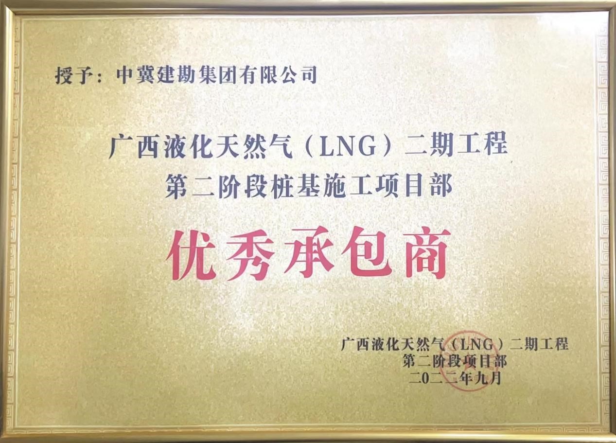 廣西液化天然氣LNG項(xiàng)目5#6#儲(chǔ)罐樁基項(xiàng)目是國(guó)家管網(wǎng)集團(tuán)北海液化天然氣有限責(zé)任公司非常重視的項(xiàng)目。我公司自2022年04月承接了廣西LNG二期項(xiàng)目?jī)?chǔ)罐樁基施工,本項(xiàng)目于2022年5月20日開(kāi)始,7月11日完成。從施工開(kāi)始,本項(xiàng)目24小時(shí)晝夜不間斷施工,為保障工程高質(zhì)量高效率完成,施工期間,建設(shè)單位、PMC單位、監(jiān)理單位及施工單位配備了充足的管理人員及施工人員,在疫情肆虐,天氣炎熱,雨季臺(tái)風(fēng)等一系列困難重重之下,廣西LNG項(xiàng)目部全體員工保持高度的工作熱情,克服一切艱難險(xiǎn)阻,順利完成了樁基施工全部任務(wù)。樁基檢測(cè)結(jié)果全部為Ⅰ類樁,保質(zhì)保量的完成了各個(gè)里程碑節(jié)點(diǎn)目標(biāo),榮獲國(guó)家管網(wǎng)集團(tuán)北海液化天然氣有限責(zé)任公司廣西北海LNG二期項(xiàng)目部的表?yè)P(yáng)信及優(yōu)秀優(yōu)秀承包商集體榮譽(yù)。