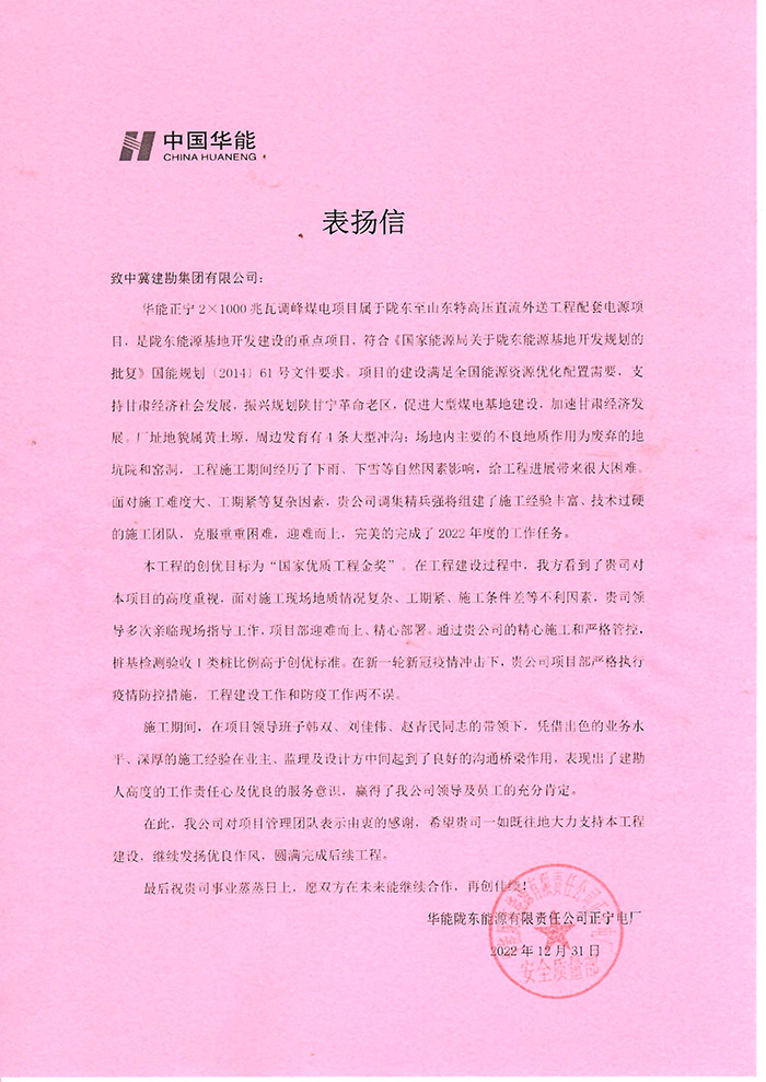我公司華能甘肅正寧電廠二期工程項(xiàng)目部收到業(yè)主方華能隴東能源公司正寧電廠發(fā)來(lái)的表?yè)P(yáng)信,施工期間,在項(xiàng)目領(lǐng)導(dǎo)的帶領(lǐng)下,憑借出色的業(yè)務(wù)水平、深厚的施工經(jīng)驗(yàn)在業(yè)主、監(jiān)理及設(shè)計(jì)方中間起到了良好的溝通橋梁作用。本工程的創(chuàng)優(yōu)目標(biāo)為“國(guó)家優(yōu)質(zhì)工程金獎(jiǎng)”,我單位負(fù)責(zé)的B標(biāo)段樁基檢測(cè)驗(yàn)收I類樁比例高于創(chuàng)優(yōu)標(biāo)準(zhǔn)。在新一輪新冠疫情沖擊下,項(xiàng)目部嚴(yán)格執(zhí)行疫情防控措施,工程建設(shè)工作和防疫工作兩不誤表現(xiàn)出了建勘人高度的工作責(zé)任心及優(yōu)良的服務(wù)意識(shí),贏得了華能隴東能源公司領(lǐng)導(dǎo)及員工的充分肯定。
