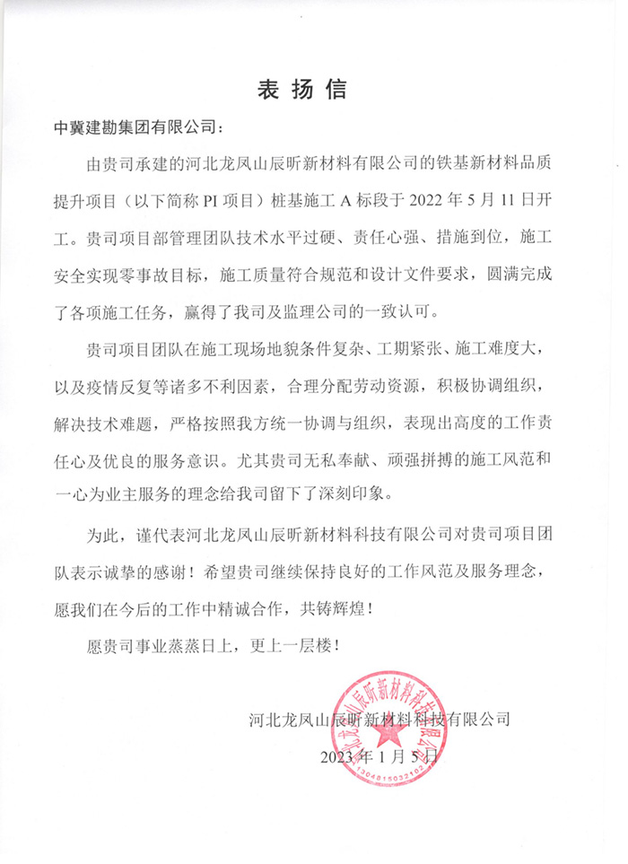 河北鐵基新材料品質(zhì)提升項(xiàng)目樁基A標(biāo)段施工工程項(xiàng)目,開(kāi)工以來(lái)圓滿完成了業(yè)主要求的各個(gè)關(guān)鍵節(jié)點(diǎn)任務(wù),施工期間以高昂的工作熱情,合理的機(jī)械人工布置,完善的施工方案及技術(shù)要求,獲得了業(yè)主們的高度認(rèn)可。同時(shí)在疫情反復(fù),現(xiàn)場(chǎng)地質(zhì)條件復(fù)雜,工期緊張等諸多不利因素的情況下,仍然頑強(qiáng)拼搏,高安全、高質(zhì)量的完成了施工任務(wù)。