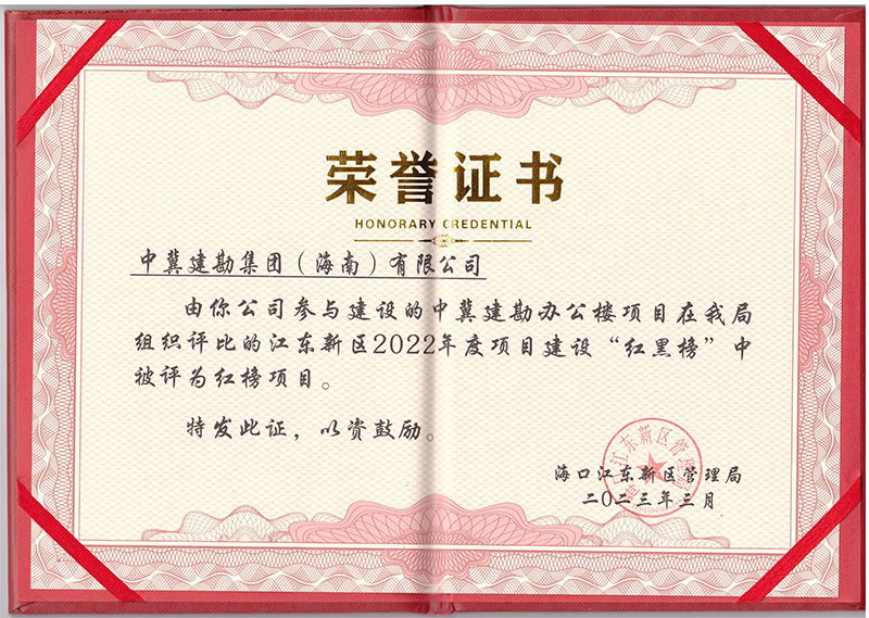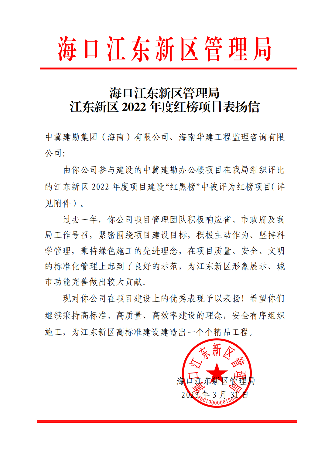 人勤春來早,實(shí)干正當(dāng)時(shí)。2023年3月31日,為促進(jìn)項(xiàng)目建設(shè)進(jìn)度,營造“安全、文明、有序”的建設(shè)氛圍,??诮瓥|新區(qū)管理局公布了2022年度項(xiàng)目建設(shè)“紅黑榜”,“中冀建勘辦公樓”項(xiàng)目再次受到表彰,并為項(xiàng)目頒發(fā)了榮譽(yù)證書。