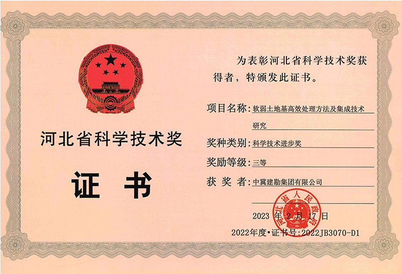近日,根據(jù)《河北省人民政府關(guān)于2022年度河北省科學(xué)技術(shù)獎(jiǎng)勵(lì)的決定》(冀政字〔2023〕14號(hào)),公司申報(bào)的《軟弱土地基高效處理方法及集成技術(shù)研究》項(xiàng)目,榮獲河北省科技進(jìn)步三等獎(jiǎng)。