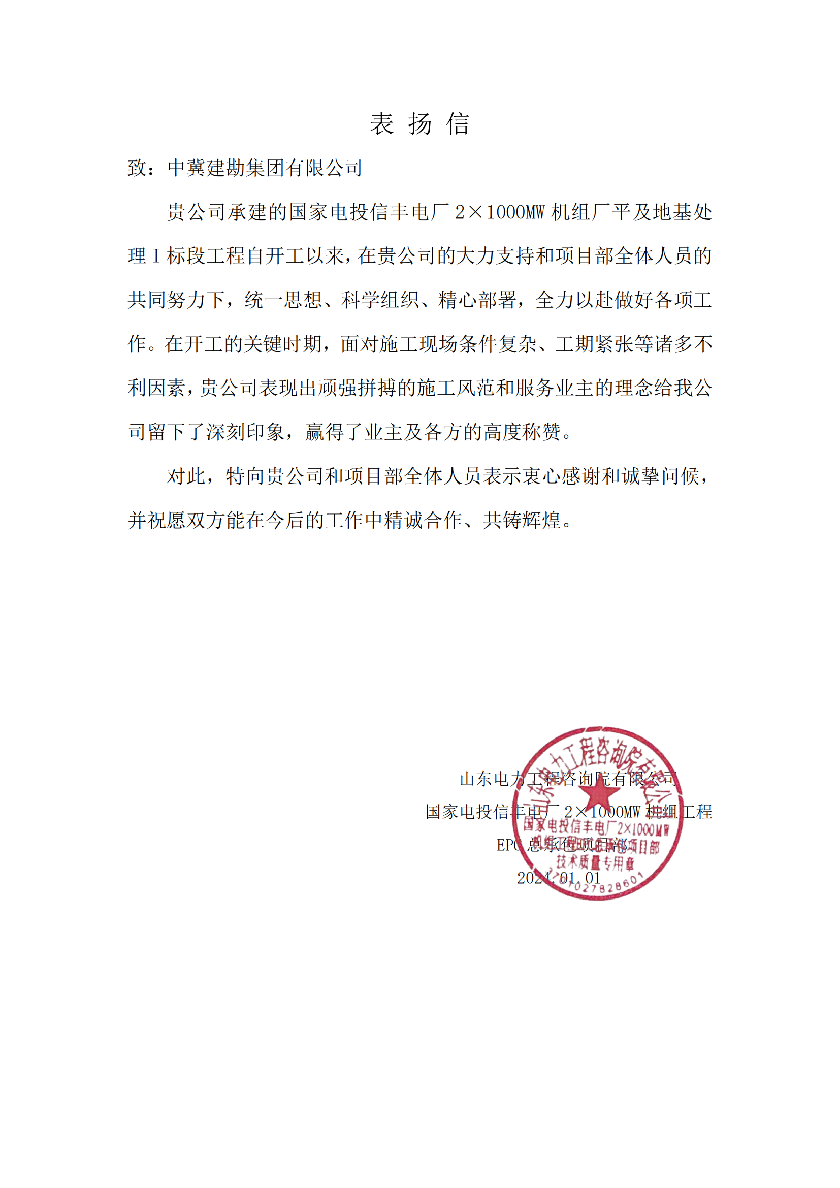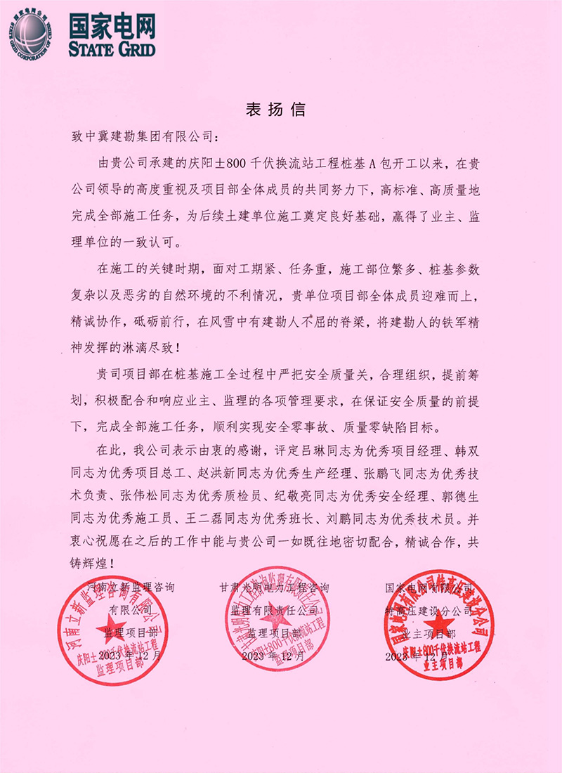 公司收到了國家電網(wǎng)慶陽±800千伏換流站工程由業(yè)主國家電網(wǎng)和監(jiān)理單位河南立新及甘肅光明的聯(lián)合表揚(yáng)信,表揚(yáng)信中說在我公司領(lǐng)導(dǎo)的高度重視及項(xiàng)目部全體成員的共同努力下,高標(biāo)準(zhǔn)、高質(zhì)量地完成施工任務(wù),為后續(xù)土建單位施工奠定良好基礎(chǔ),贏得了業(yè)主、監(jiān)理單位的一致認(rèn)可。在施工的關(guān)鍵時期,我單位項(xiàng)目部全體成員迎難而上,精誠協(xié)作,砥礪前行,在風(fēng)雪中有建勘人不屈的脊梁,將建勘人的鐵軍精神發(fā)揮的淋漓盡致!