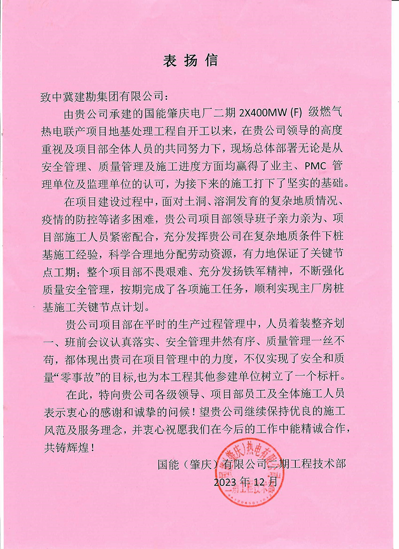 國能肇慶電廠二期2×400MW(F)級燃?xì)鉄犭娐?lián)產(chǎn)項(xiàng)目為二期擴(kuò)建工程,在總公司及領(lǐng)導(dǎo)們的幫助下攻堅(jiān)克難,面對土洞、溶洞發(fā)育的復(fù)雜地質(zhì)情況、疫情的防控等諸多困難,充分發(fā)揚(yáng)鐵軍精神,不斷強(qiáng)化質(zhì)量安全管理,積極配合業(yè)主進(jìn)度計(jì)劃,按期完成了各項(xiàng)施工任務(wù)。我單位在安全管理、施工質(zhì)量管理方面為建設(shè)方、PMC管理單位、監(jiān)理方留下深刻影響,為此項(xiàng)目部得到了國能(肇慶)熱電有限公司的高度認(rèn)可!