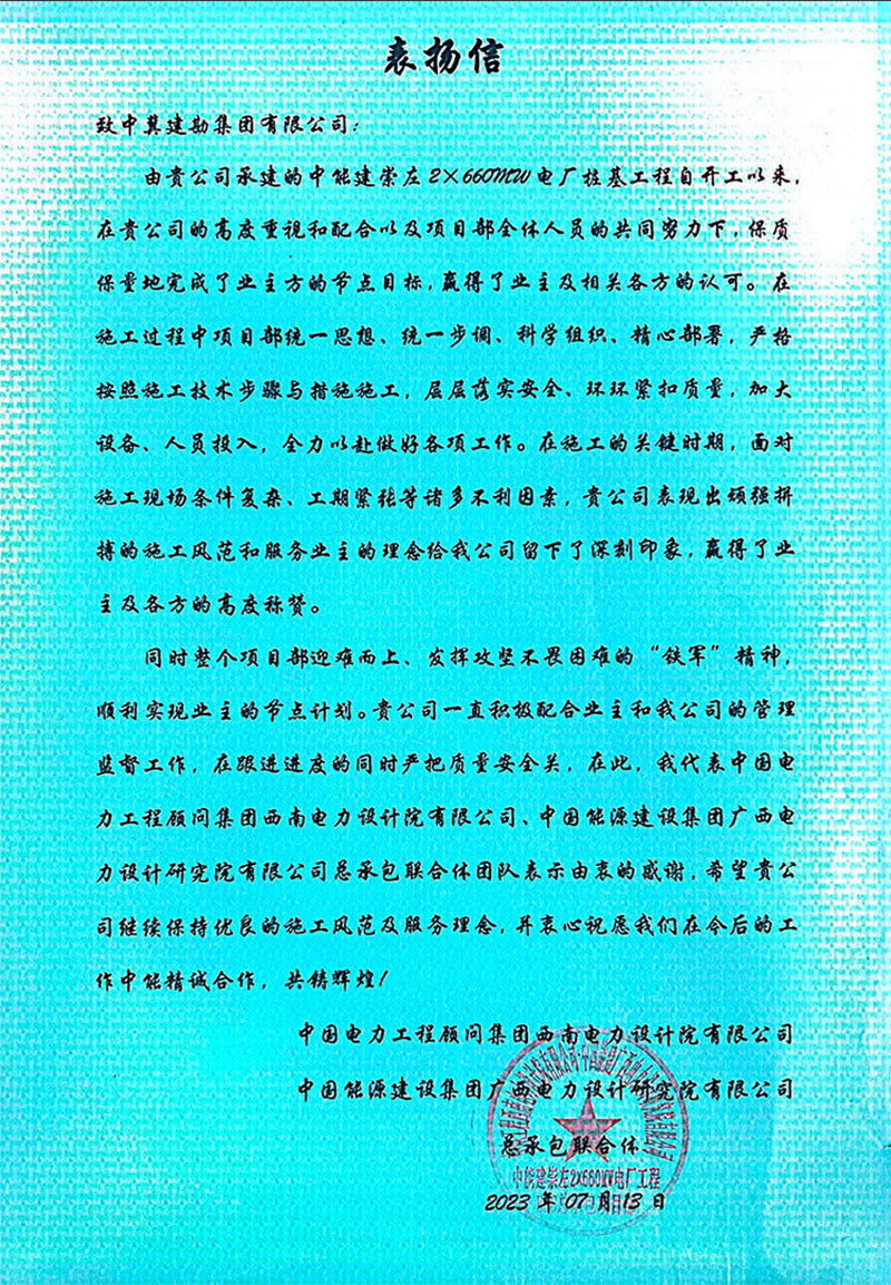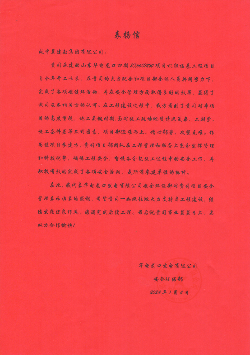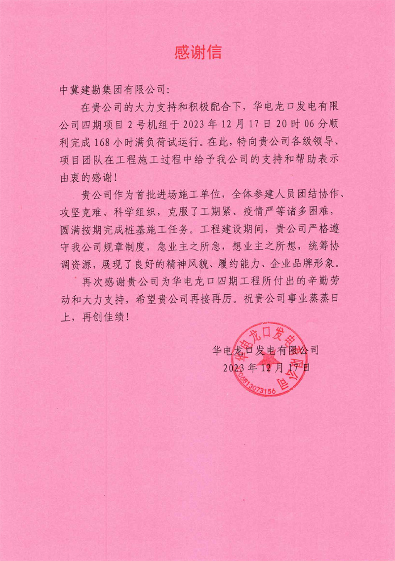 華電龍口發(fā)電有限公司四期項(xiàng)目2號機(jī)組于2023年12月17日20時04分順利完成168小時滿負(fù)荷試運(yùn)行。工程建設(shè)期間,完成了各項(xiàng)安健環(huán)活動,并在安全管理方面取得良好的效果,贏得了業(yè)主方認(rèn)可。我公司人員嚴(yán)格遵守我公司規(guī)章制度,急業(yè)主之所急,想業(yè)主之所想,統(tǒng)籌協(xié)調(diào)資源,展現(xiàn)了良好的精神風(fēng)貌、履約能力、企業(yè)品牌形象。為此,業(yè)主特向我公司各級領(lǐng)導(dǎo)、項(xiàng)目團(tuán)隊(duì)在工程施工過程中給予的支持和幫助表示由衷感謝。
