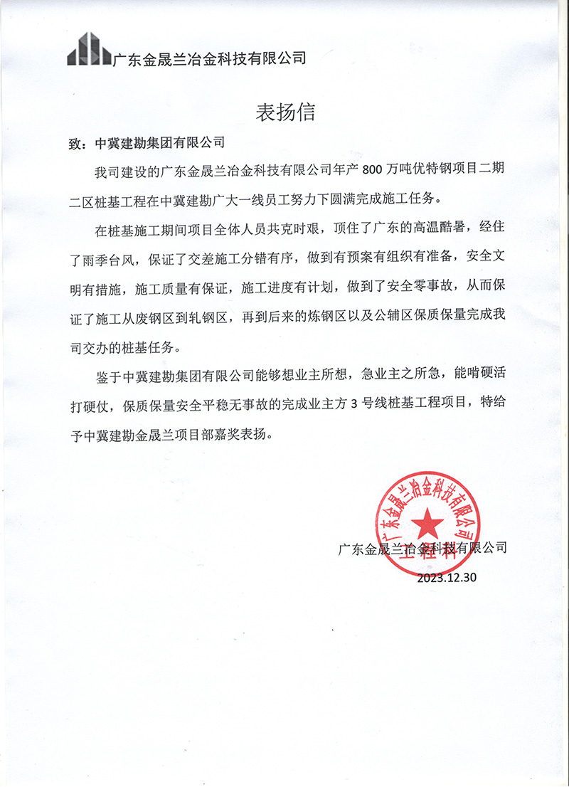 廣東金盛蘭冶金科技有限公司年產(chǎn)800萬噸優(yōu)特鋼項(xiàng)目二期二區(qū)樁基工程,在施工期間項(xiàng)目全體人員共克時艱,頂住了廣東的高溫酷暑,經(jīng)住了雨季臺風(fēng),保證了交差施工分錯有序,做到了預(yù)案有組織有準(zhǔn)備,安全文明有措施,施工質(zhì)量有保證,施工進(jìn)度有計(jì)劃,做到了安全零事故,保質(zhì)保量的完成任務(wù),業(yè)主對項(xiàng)目給予嘉獎表揚(yáng)。