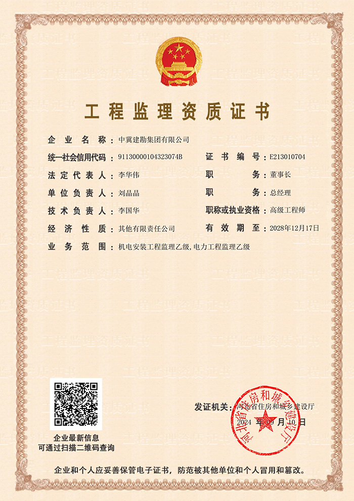為進(jìn)一步拓展公司業(yè)務(wù)范圍,完善工程監(jiān)理資質(zhì)類別,集團(tuán)公司于2024年9月10日通過河北省住房和城鄉(xiāng)建設(shè)廳審核,取得了機(jī)電安裝工程監(jiān)理乙級資質(zhì)。