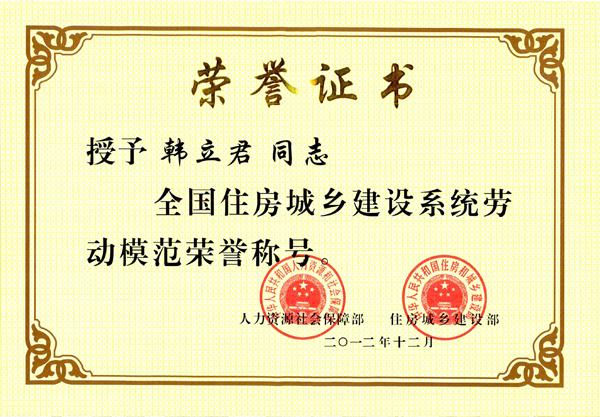 為進一步激勵全國住房城鄉(xiāng)建設系統(tǒng)廣大干部職工的積極性、主動性、創(chuàng)造性,促進住房城鄉(xiāng)建設事業(yè)健康持續(xù)發(fā)展,人力資源和社會保障部、住房和城鄉(xiāng)建設部在全國住房城鄉(xiāng)建設系統(tǒng)內(nèi),開展了先進集體和先進個人的評選活動。經(jīng)過公司及各級人力資源社會保障部門、住房城鄉(xiāng)建設管理部門的逐級推薦,報評選表彰工作領導小組審查通過后,最后由住房城鄉(xiāng)建設部黨組和人力資源社會保障部審定,評選出先進集體200個,先進工作者450名,勞動模范350名。其中,我公司董事長韓立君同志榮獲全國住房城鄉(xiāng)建設系統(tǒng)勞動模范稱號。