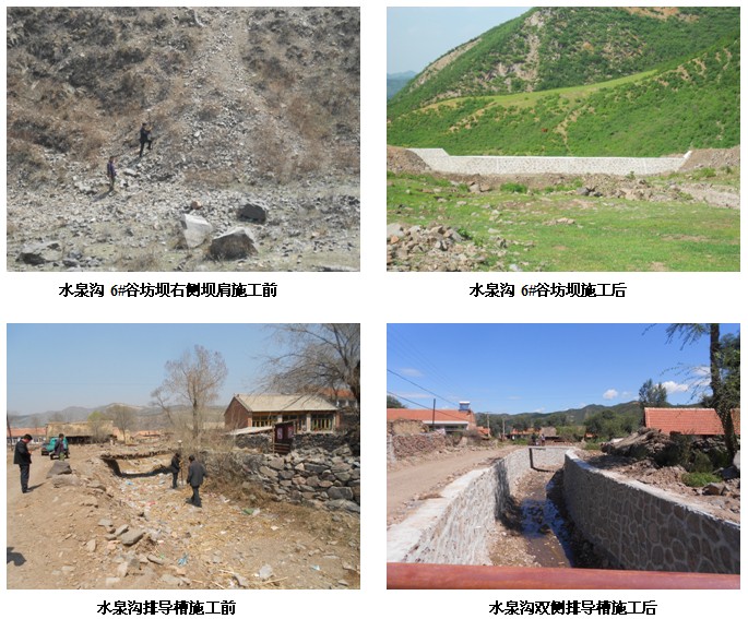 本治理工程施工時間為2013年5月8日-2013年9月10日,包括水泉村范圍內(nèi)水泉溝、王小溝兩條溝谷,主要施工項目為谷坊壩、排導槽、擋墻工程,其中水泉溝內(nèi)包括6道谷坊壩,PM2坡面護腳擋墻,水泉溝單側排導槽(0~249.3m),水泉溝雙側排導槽(0~708.6m),王小溝內(nèi)包括道谷坊壩7道,王小溝單側排導槽(0~271.2m),王小溝雙側排導槽(0~372m)。