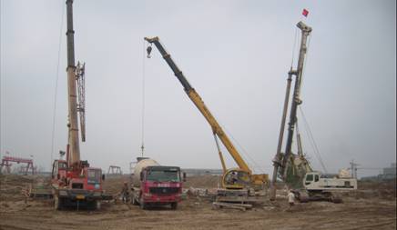 本工程樁基采用后壓漿旋挖鉆孔灌注樁,完成了高效沉降槽、種子過濾、1#、2#、3#、4#焙燒爐、電除塵、平盤過濾、預脫硅槽、高位槽、種子分解、1#、2#、3#、4#冷卻塔、1#、2#、3#鋁粉倉、棧橋、堿液調配、提升機、礦漿槽和蒸發(fā)器、礦漿槽、蒸發(fā)器、冷卻塔、堿液調配、預脫硅槽、高位槽。施工主要內容包括:測量放線、鋼筋籠制作、運輸與吊裝、成孔、混凝土攪拌與運輸、水下混凝土灌注、后壓漿、渣土清運等。共完成直徑1000mm、800mm和600mm的灌注樁共4501根,樁身混凝土為C25和C30兩種,混凝土設計方量81773.8m3,實際灌注方量95288.0m3,平均充盈系數(shù)1.17。