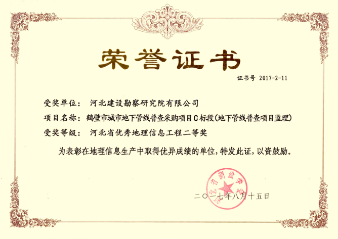 近日,經(jīng)河北省測(cè)繪學(xué)會(huì)評(píng)選,由我公司承擔(dān)的鶴壁市城市地下管線普查采購項(xiàng)目C標(biāo)段(地下管線普查項(xiàng)目監(jiān)理)榮獲河北省優(yōu)秀地理信息工程二等獎(jiǎng)。