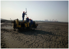 根據(jù)工程要求、地層特點(diǎn)及擬采用的基礎(chǔ)形式,勘察手段采用了鉆探、標(biāo)準(zhǔn)貫入試驗(yàn)、波速測(cè)試、十字板剪切試驗(yàn)及扁鏟側(cè)脹試驗(yàn),關(guān)鍵環(huán)節(jié)照片詳見圖2-圖6。土工試驗(yàn)項(xiàng)目包括含水量試驗(yàn)、界限含水量試驗(yàn)、比重試驗(yàn)、直接快剪試驗(yàn),固結(jié)快剪試驗(yàn)、三軸固結(jié)不排水剪切試驗(yàn)、顆分試驗(yàn)(篩分法、水析法)、水質(zhì)簡(jiǎn)分析及土的易溶鹽試驗(yàn)、室內(nèi)滲透試驗(yàn)(水平、豎直)、無(wú)側(cè)限抗壓強(qiáng)度試驗(yàn)(原狀土)等。