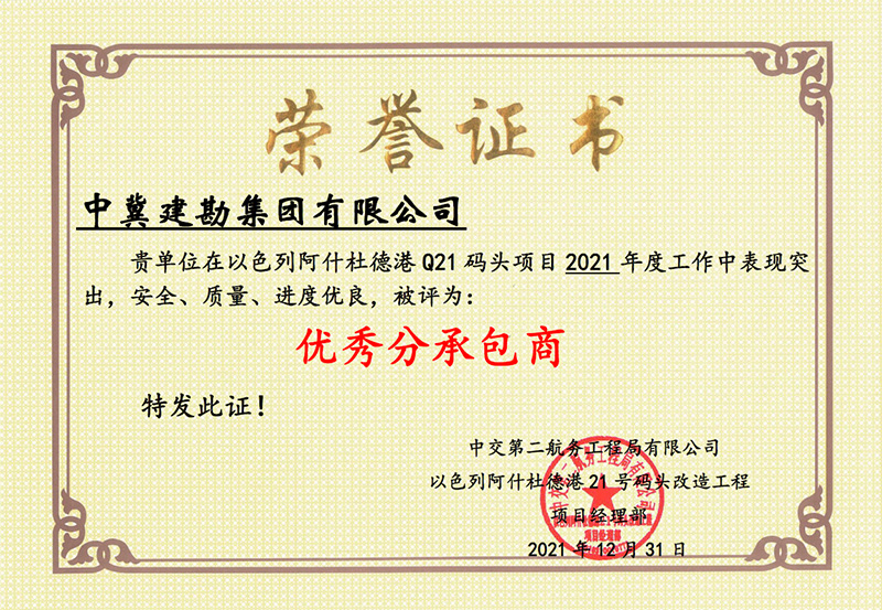 其中,以色列阿什杜德港Q21碼頭項目榮獲“優(yōu)秀分承包商”團隊獎,李五一榮獲“優(yōu)秀項目經(jīng)理”、賀海亮榮獲“SHE管理先進個人”、宋宇峰榮獲“優(yōu)秀質量管理先進個人”、張軍鋒榮獲“優(yōu)秀管理先進個人”、李良啟、聶彥科榮獲“優(yōu)秀技術操作手”、劉宗正榮獲“優(yōu)秀電工”、張秋東榮獲“優(yōu)秀后勤”、趙杰榮獲“優(yōu)秀操作標兵”榮譽稱號。