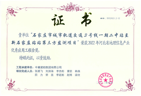近日,由河北省地理信息產(chǎn)業(yè)協(xié)會評選,公司榮獲2020-2021年度河北省地理信息產(chǎn)業(yè)甲級測繪資質(zhì)“十佳單位”榮譽(yù)稱號,赫英超同志榮獲河北省地理信息產(chǎn)業(yè)“優(yōu)秀青年管理人才”稱號;同時石家莊市城市軌道交通3號線一期二中站至新石家莊站站第三方監(jiān)測項目榮獲“2022年度河北省地理信息產(chǎn)業(yè)優(yōu)秀應(yīng)用工程金獎”。