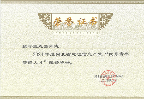 近期,由河北省地理信息產(chǎn)業(yè)協(xié)會(huì)評選,我公司被授予第五屆理事會(huì)“先進(jìn)工作單位”榮譽(yù)稱號和2022-2023年度河北省地理信息產(chǎn)業(yè)“十佳單位”榮譽(yù)稱號,蓋忠奎同志榮獲2024年度河北省地理信息產(chǎn)業(yè)“優(yōu)秀青年管理人才”稱號。