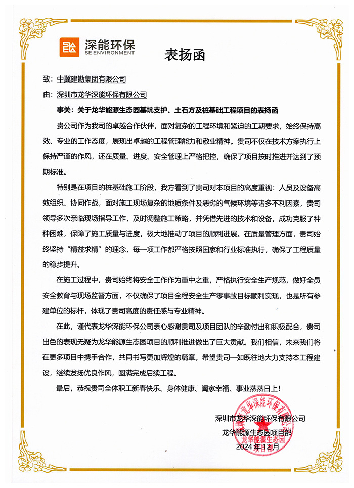 2024年12月20日,深圳市龍華深能環(huán)保有限公司發(fā)來表揚信,對我公司正在施工的龍華能源生態(tài)源基坑支護、土石方及樁基礎(chǔ)工程項目在施工過程中,面對復(fù)雜的工程環(huán)境和緊迫的工期要求,始終保持高效、專業(yè)的工作態(tài)度,展現(xiàn)出卓越的工程管理能力和敬業(yè)精神,在技術(shù)方案執(zhí)行上嚴謹?shù)淖黠L(fēng),質(zhì)量、進度、安全管理上嚴格的把控,以及我公司領(lǐng)導(dǎo)多次親臨現(xiàn)場指導(dǎo)工作,確保了項目按時推進并達到了預(yù)期標準,表示了衷心的感謝,并表達了未來將有更多的項目攜手合作。