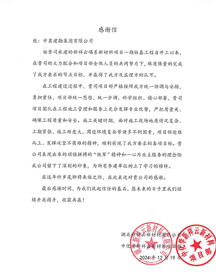 2024年12月19日,湖北新祥云新材料有限公司發(fā)來感謝信,對我公司正在施工的新祥云磷系新材料項目一期樁基工程在施工過程中,嚴格按照業(yè)主統(tǒng)一協(xié)調(diào)和安排,勇?lián)負?dān),面對地質(zhì)情況復(fù)雜、工期緊張、施工難度大等諸多不利因素,項目部迎難而上,發(fā)揮功堅克難的精神,順利完成了各項目標。對項目部表現(xiàn)出來的頑強拼搏的“鐵軍”精神和一心為業(yè)主服務(wù)的理念給予了表揚,特在年終歲尾之際發(fā)來感謝信。